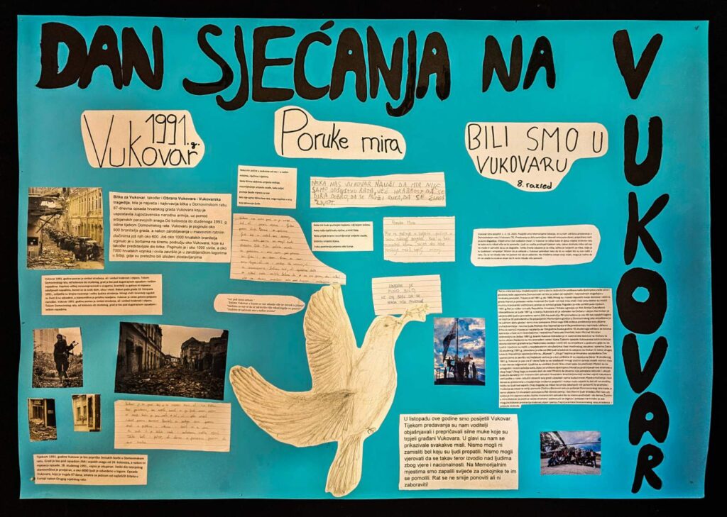 Povodom Dana sjećanja na žrtve Domovinskog rata i Dana sjećanja na žrtvu Vukovara i Škabrnje naši su se učenici na dostojanstven i kreativan način prisjetili žrtava i odali im počast. Učenici su oslikavali simbole Vukovara, pronalazi dirljive i prije svega poučne citate iz knjige “Priče iz Vukovara” Siniše Glavaševića kojima su, zajedno s prekrasnim fotografijama naše učiteljice Ane koje je stvorila i donijela kao uspomenu s terenske nastave u Vukovaru, ukrasile naš Zid sjećanja u čijoj su izradi sudjelovali i naši najmlađi učenici iz produženog boravka. Sedmaši su i osmaši s učiteljicama Ninom i Majom pogledali dokumentarni film o oduzetoj mladosti i traganju za mirom. Ostali su učenici na satu Hrvatskoga jezika čitali poeziju i prozu pisanu u ratnim vremenima, a koja nam je ostavljena kao zalog za budućnost i trag vremena u kojemu su prekinuta mnoga djetinjstva da bi ih mi danas mogli slobodno i bezbrižno živjeti.